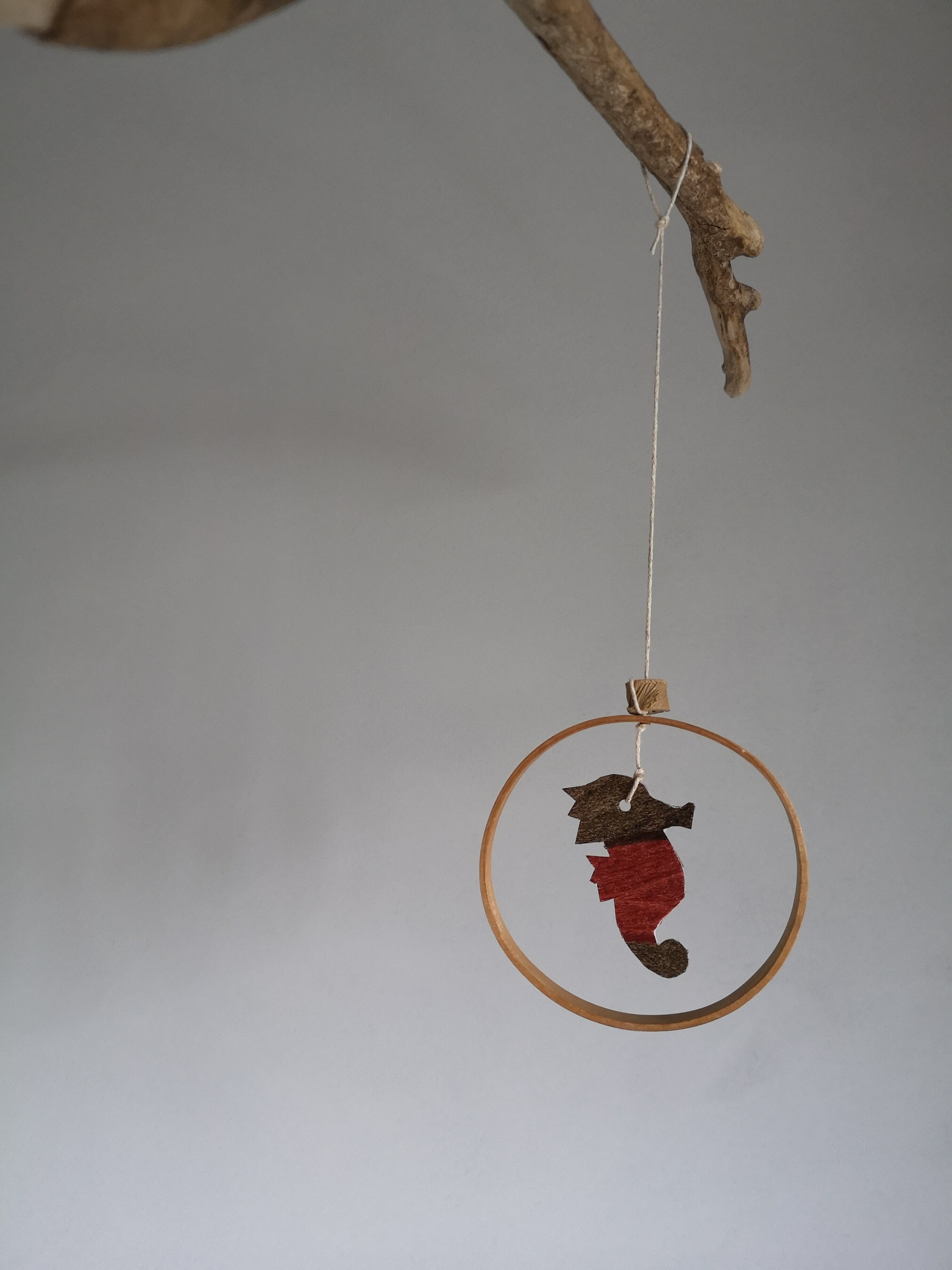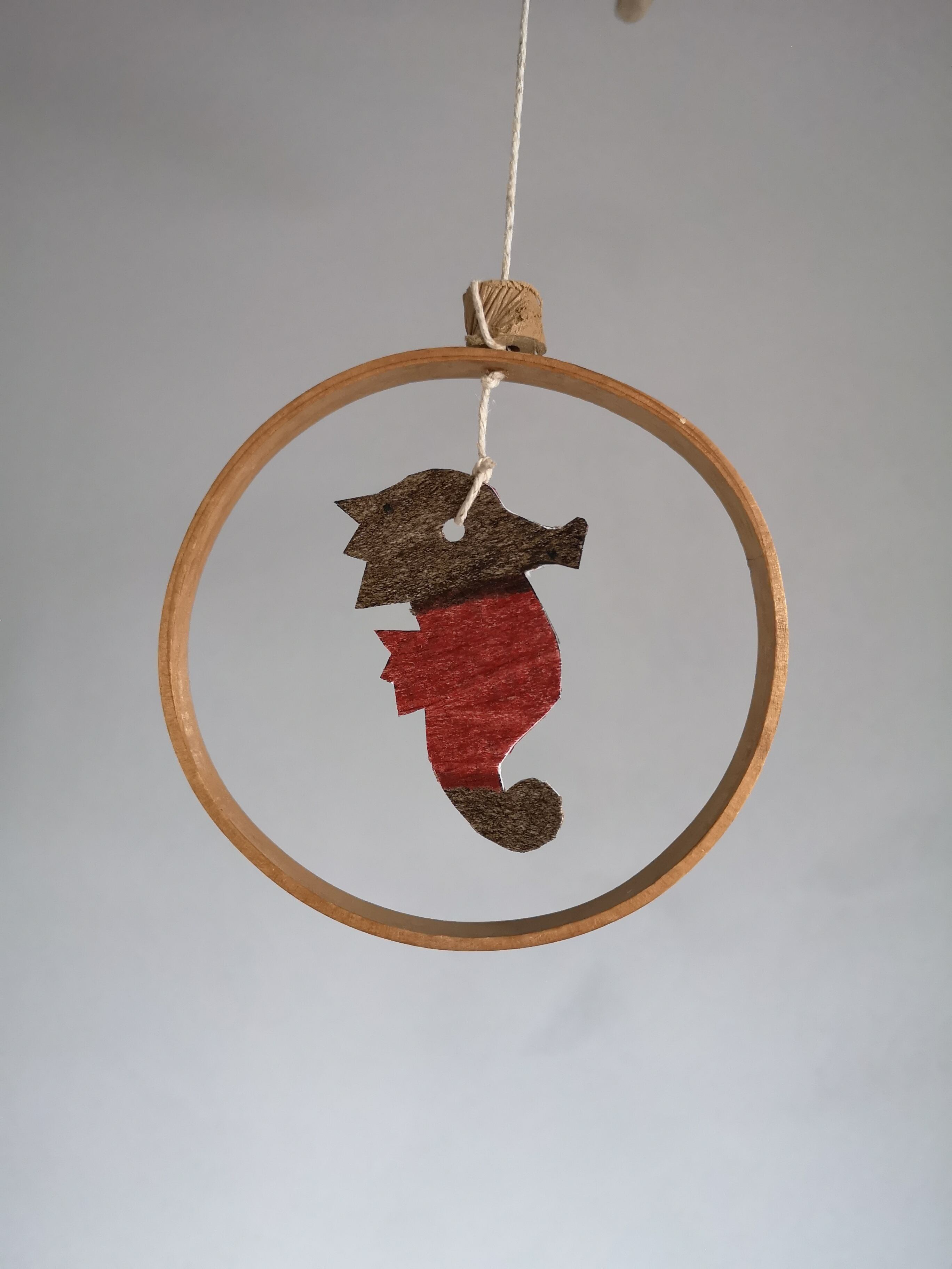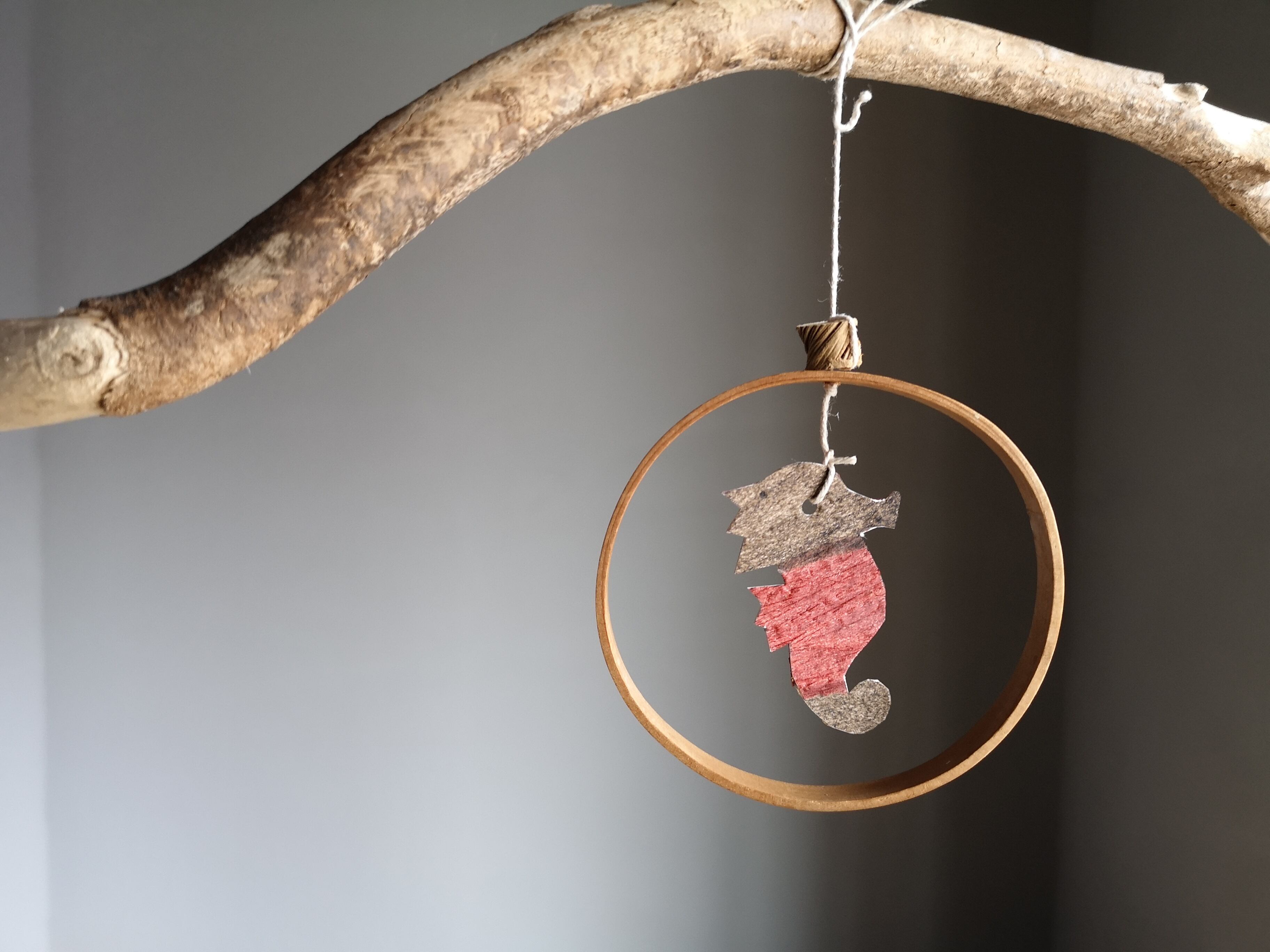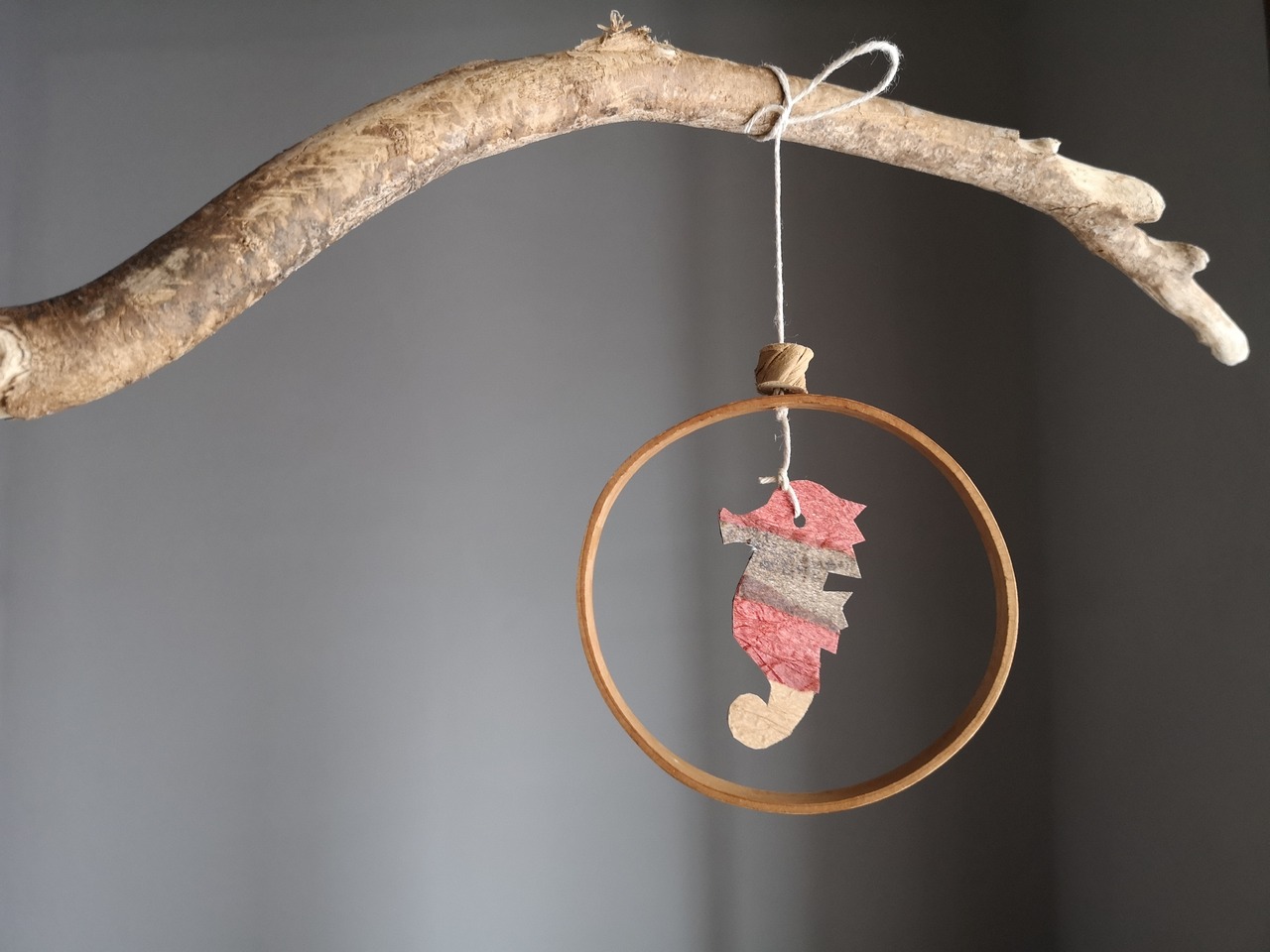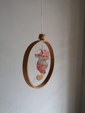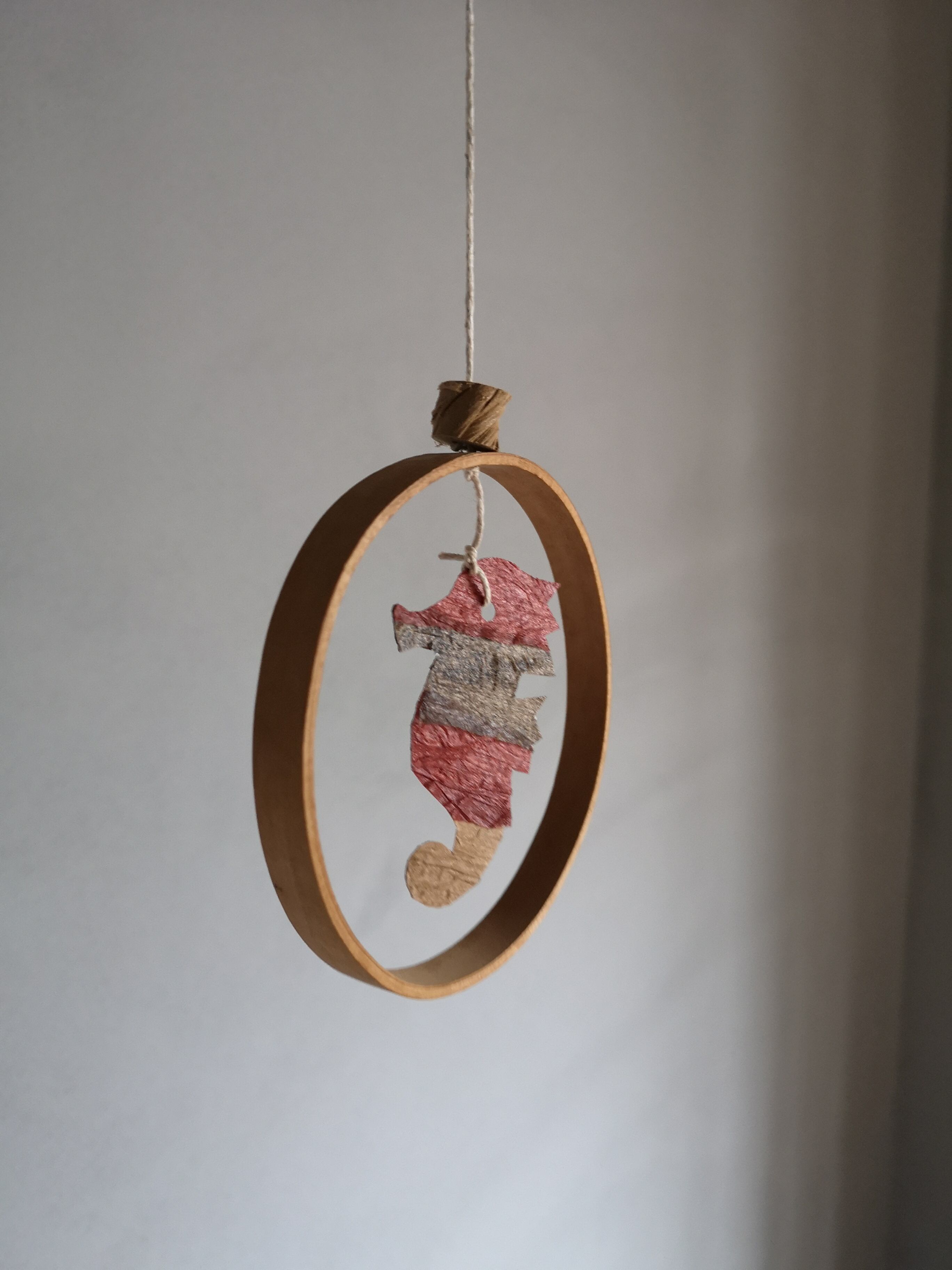 漆器の制作には漆を濾こす工程があり、不純物を取り除くために漆うるし濾紙こしがみ〈吉野紙〉が使われます。本来は捨てられる漆濾紙をリユースした手づくりモビールです。漆の深い色味と、漆をぎゅっと絞った後のシワのテクスチャーが美しい漆濾紙を、台紙どおりのかたちに切って、貼り付けて、木製の輪っかに吊り下げました。この輪っかも、かつて工房で漆器を重ねるために使われていた曲げ輪。