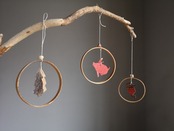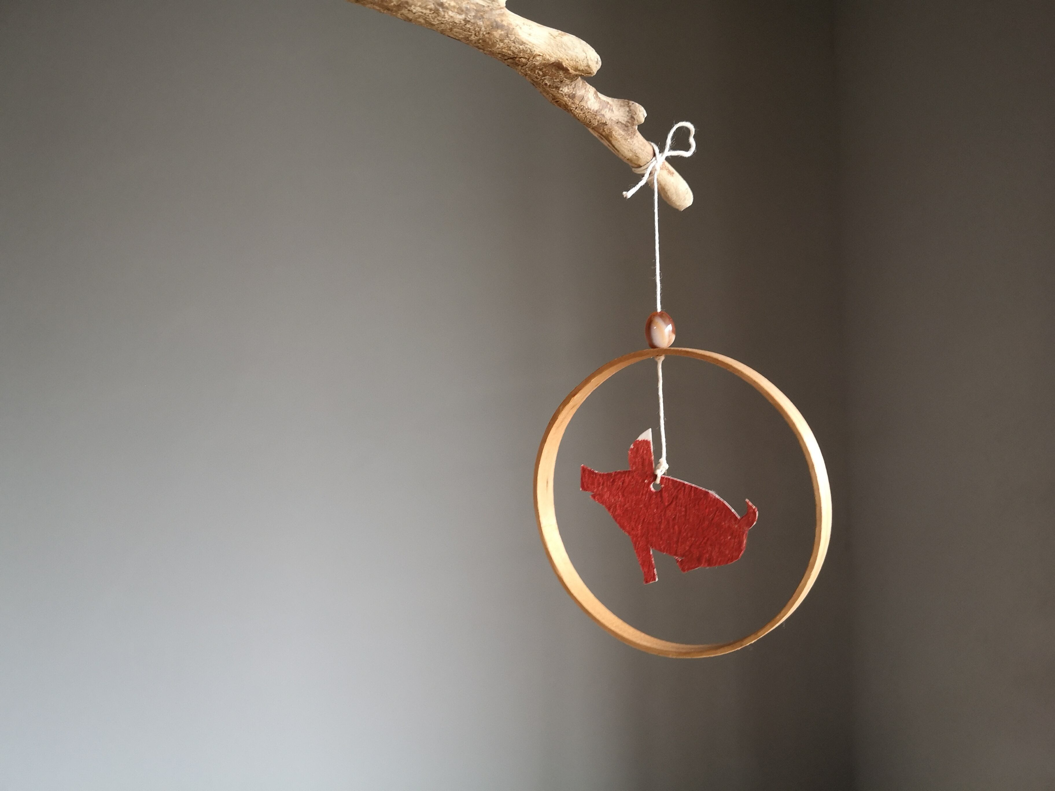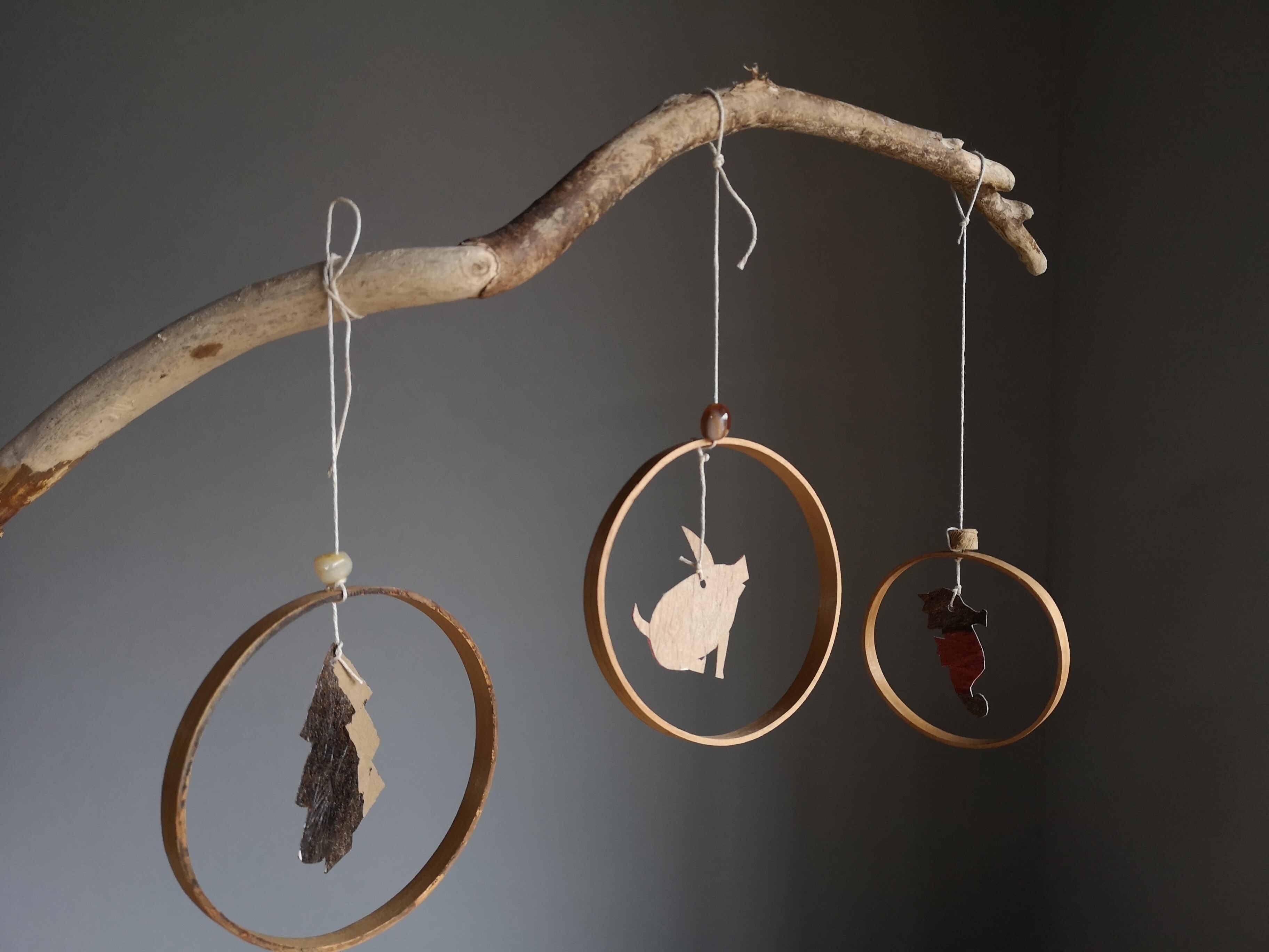 漆器の制作には漆を濾こす工程があり、不純物を取り除くために漆うるし濾紙こしがみ〈吉野紙〉が使われます。本来は捨てられる漆濾紙をリユースした手づくりモビールです。漆の深い色味と、漆をぎゅっと絞った後のシワのテクスチャーが美しい漆濾紙を、台紙どおりのかたちに切って、貼り付けて、木製の輪っかに吊り下げました。この輪っかも、かつて工房で漆器を重ねるために使われていた曲げ輪。