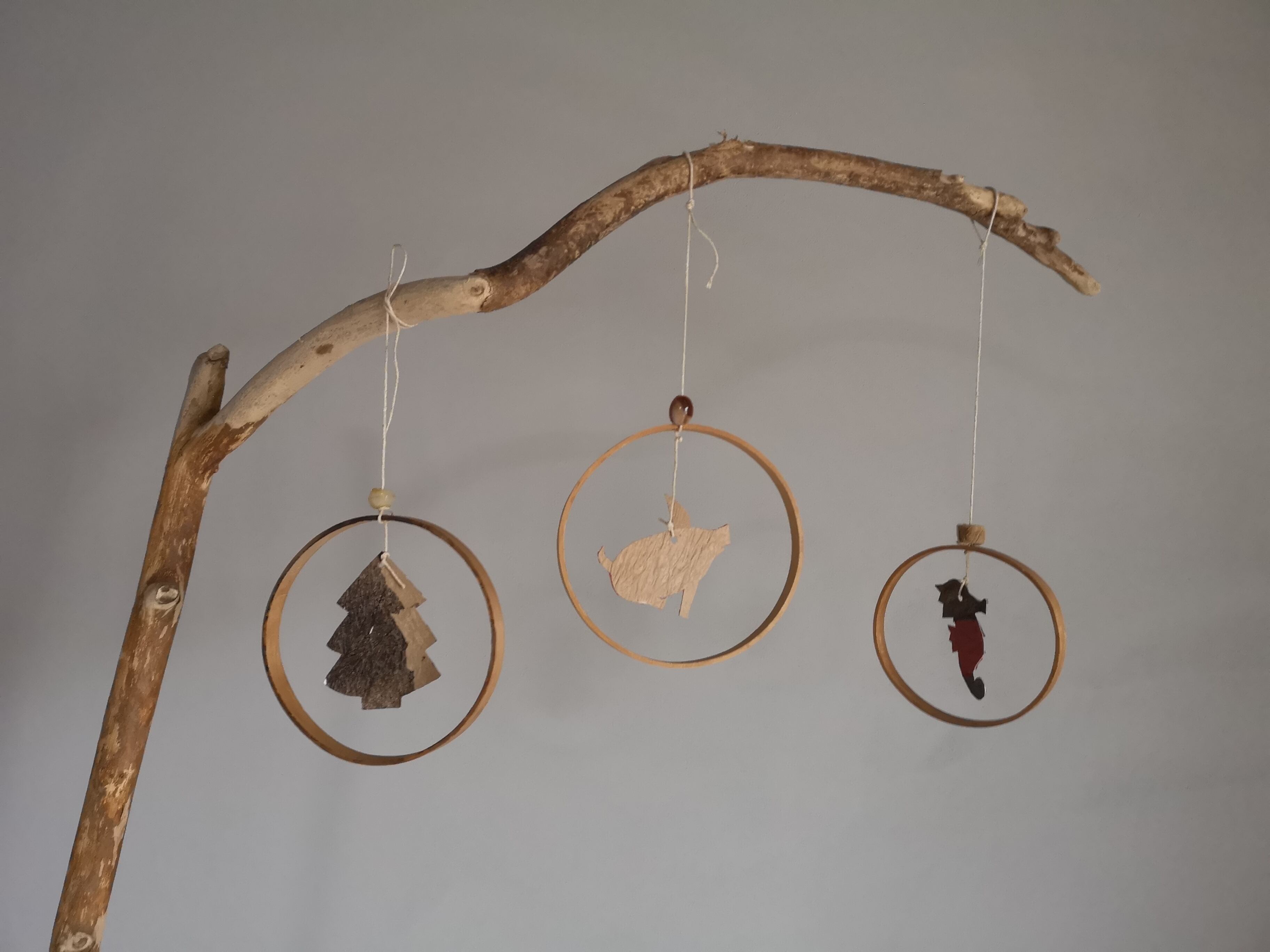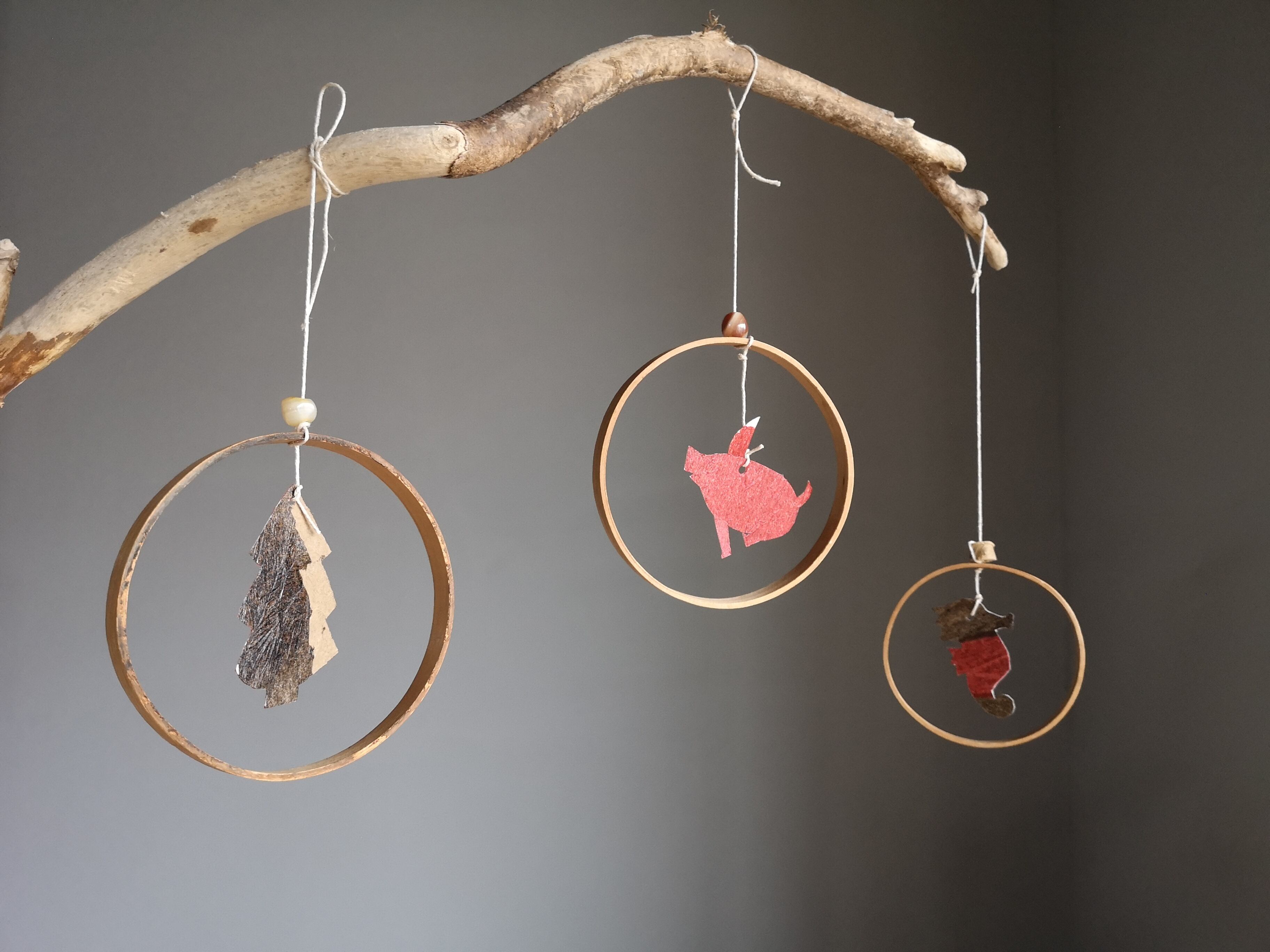 漆器の制作には漆を濾こす工程があり、不純物を取り除くために漆うるし濾紙こしがみ〈吉野紙〉が使われます。本来は捨てられる漆濾紙をリユースした手づくりモビールです。漆の深い色味と、漆をぎゅっと絞った後のシワのテクスチャーが美しい漆濾紙を、台紙どおりのかたちに切って、貼り付けて、木製の輪っかに吊り下げました。この輪っかも、かつて工房で漆器を重ねるために使われていた曲げ輪。